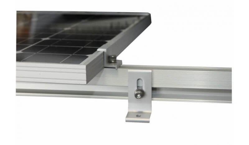 Для крепления солнечных панелей к рейлингам вам понадобятся следующие компоненты - концевые зажимы и центральные зажимы. Обычно панели кладутся на 2 парралельных рейлинга и фиксируются необходимыми зажимами. Например, для 2 солнечных батарей шириной около 1 метра, вам понадобятся 2 рейлинга по 2,4м, L-образные крепления - 6шт (по 3шт на каждый рейлинг), по краям панелей будут использоваться концевые зажимы - 4шт и между панелями центральные зажимы - 2шт.